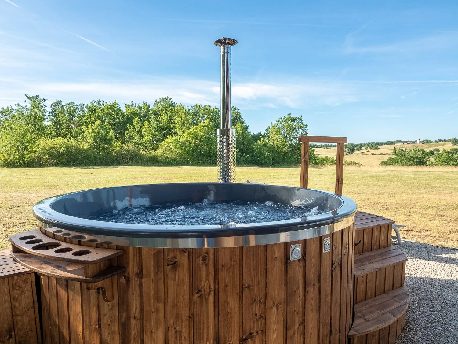 Hot tub, sauna and outdoor pool overlooking the remote French countryside.